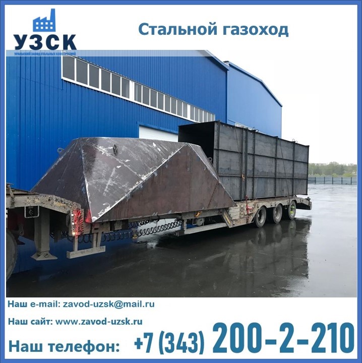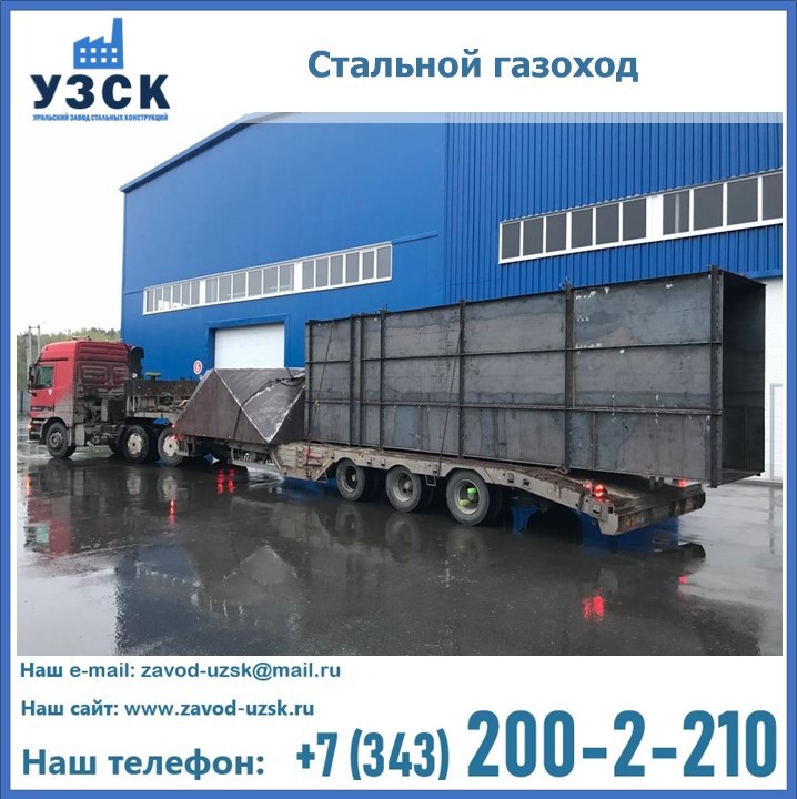 Газоход прямоугольный, стальной 1,4х2,3х7,8 метров, отвод газохода диаметром 3 метра и переход с диаметра 3 метра на прямоугольник 3х4,2 метра были изготовлены и отгружены на склад завода «Невьянский цемент». Производство газоходов на площадке «Уральского Завода Стальных Конструкций» было выполнено в точном соответствии с проектом заказчика, по индивидуальному чертежу. УЗСК изготовитель стальных газоходов. Собственный конструкторский отдел, Лаборатория неразрушающего контроля, необходимое оборудование и станки, оперативные поставки металла по низкой цене дают возможность нам формировать оптимальную стоимость на стальные газоходы.